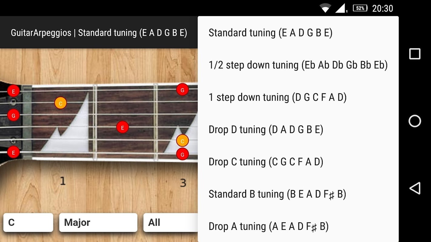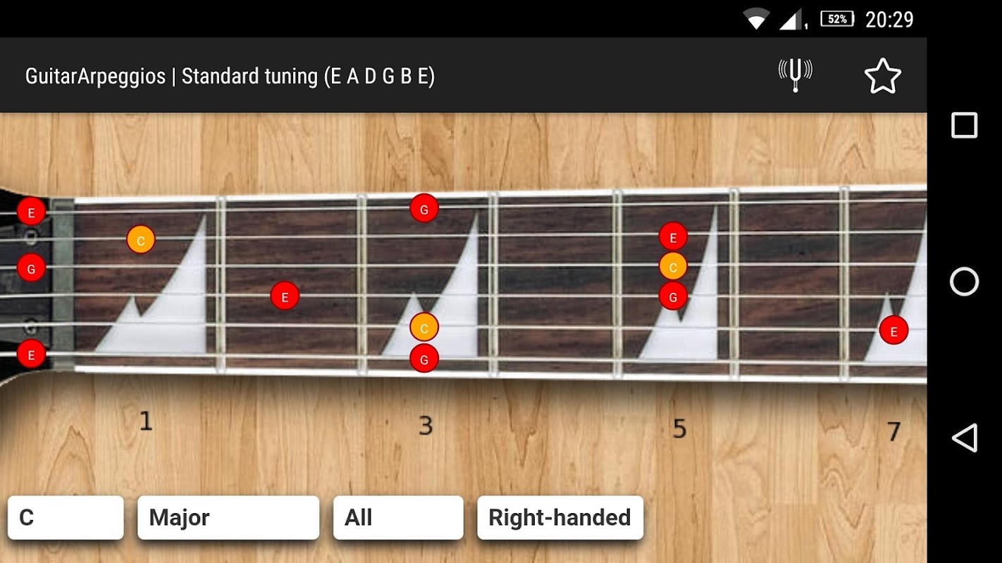 Dit is een gratis app om arpeggio's op een gitaarhals te leren. Klik op de notitie om deze af te spelen. Het heeft arpeggio's voor standaard en enkele drop-stemmingen.