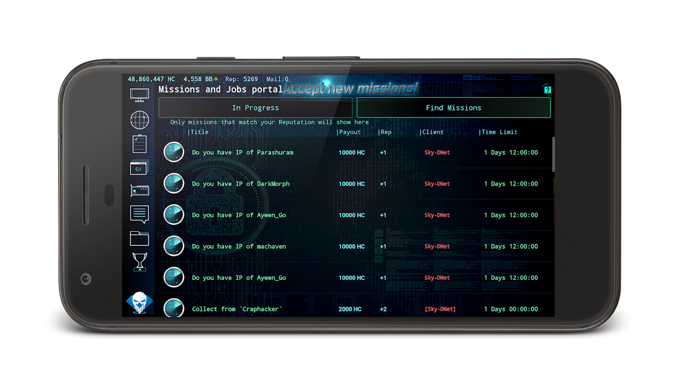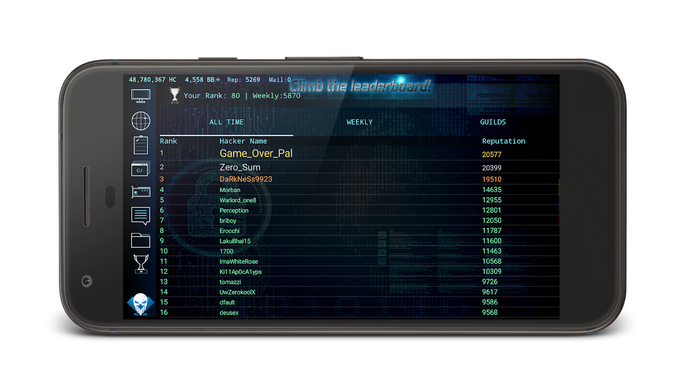 Upgrade your hardware and software, use your A.I and tools to hack into other players and corporations to steal and decrypt secret files, or join a guild and conspire to gain access to another guilds data-centers' main server and destroy it by planting dDoS bots into other players! Meet new friends and plant virtual-viruses in your enemies gateways!
