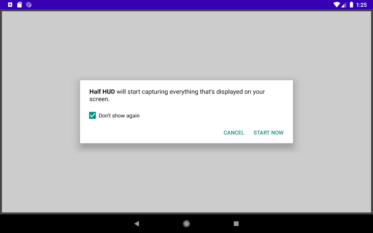 » Android blijft toestemming vragen voor Half HUD om het scherm op te nemen, wanneer het start en wanneer je het scherm draait. Op mijn telefoon wordt gevraagd "Half HUD zal beginnen met het vastleggen van alles wat op je scherm wordt weergegeven", maar waarschijnlijk wordt elders een andere bewoording gebruikt. Deze functionaliteit is duidelijk nodig, omdat het de basis vormt van hoe de app werkt. Wat minder duidelijk is, is of er iets kan worden gedaan om slechts één keer te antwoorden, maar het eerste onderzoek suggereert van niet, dus het blijft vragen en je blijft bevestigen.