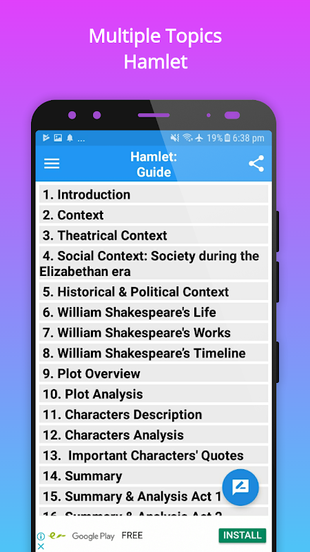 This Guide app works both online and offline, and contains 35 basic topics about one of the famous plays of William Shakespeare, Hamlet.