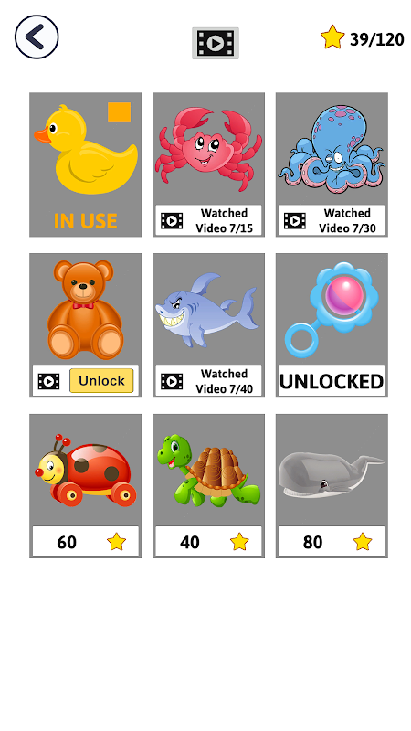 in dit spel kun je de speler die jou vertegenwoordigt uit meerdere keuzes wisselen, het is aan jou om te kiezen wat je wilt van zeedieren of speelgoed, hier is wat je zou kunnen kiezen Eend, Krab, Octopus, Schildpad, marionet, haai, walvis, auto speelgoed of schudspeelgoed