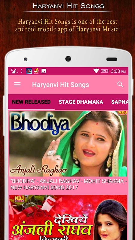 Welcome to world of Haryana, Haryanvi Hit Songs is one of the best android mobile app of Haryanvi Music. Here you get top Haryanvi songs of best singers and best artist. Here we will provide you video songs of “Sapna Chaudhary”, “Anjali Raghav”, “Ajay Hooda”, “RC Upadhyay”, “Pooja Hooda”, “Raju Punjabi” and many more.