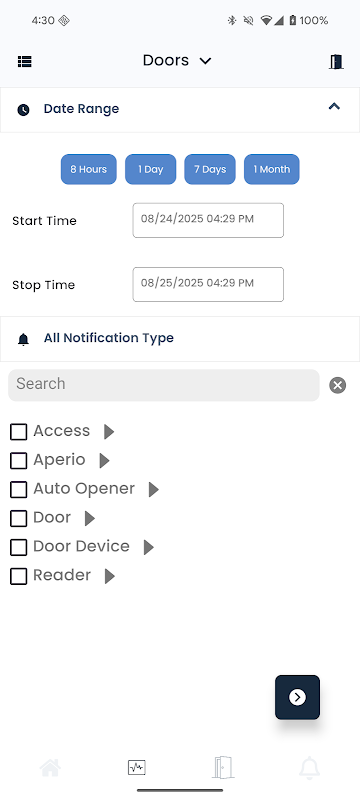 - Historische meldingen voor uw deuren, verdiepingen, ingangen, uitgangen en actieplannen bekijken