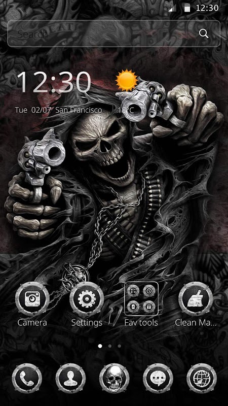 Hell Devil Death Skull Theme with rocking hell skeleton skull holding gun in hand wallpaper skin is a very good choice. We have 60 specially designed dark style application icons. 3D Devil skull, dark skull king holding a guns in hand inspiration to complete the Hell Devil Death Skull Theme. If you like the horror skull theme or death skeleton skull theme and death skull theme, you will love this hell skull skeleton theme and it will bring you a surprise. Skeleton are in Horror jungle art background, dark night jungle, skeleton rock wallpaper, Hell Devil Death Skull Theme some unique fantastic horror ghost theme, so it looks very cool. Hell skeleton skull leader, with gun and rock reveal a sense of death, showing the charm of the skeleton totem. If you want us to make a special DIY wallpaper skin you just need to contact us via email. Let your phone a variety of cool animations unique. So get this color theme now FREE!