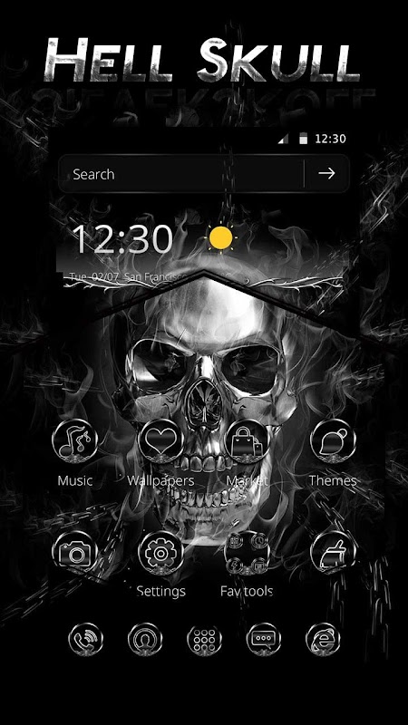You can get Hell Skull phone theme with glitter silver skeleton live wallpaper and black & silver lock screen and silver icons pack! Hell Skull is an Android mobile theme with 3D effects, 3D weather, delicate app icon packs and silver flaming skeleton wallpaper. Hell Skull Theme is supported on most Android devices. Install the theme for a 3D home screen and to make your phone look cool!