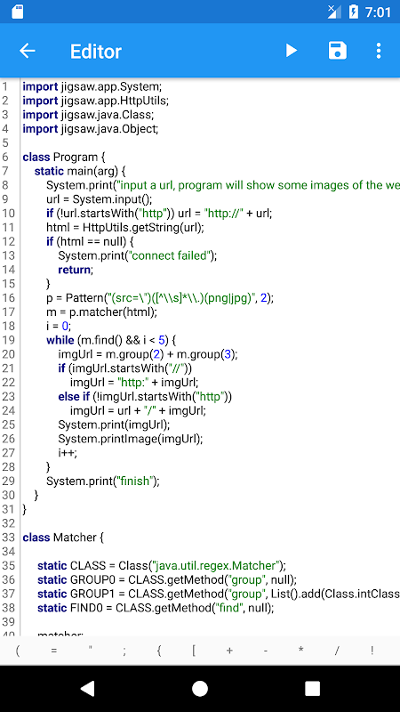 HelloWorld is a coding IDE where you can call many android system functions by writing a simple program. This app provide api to access to network, read/write files, use android accessibility service. That means HelloWorld can not only be used to learn programming, but also create some automation scripts such as web crawler.
