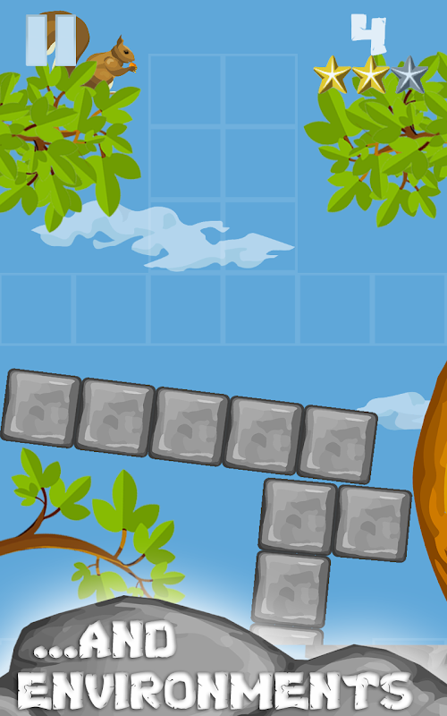 Drag to create blocks of different shapes, that support one another to reach the top and build a bridge. Make different shapes that are stable enough to support a squirrel jumping over them.