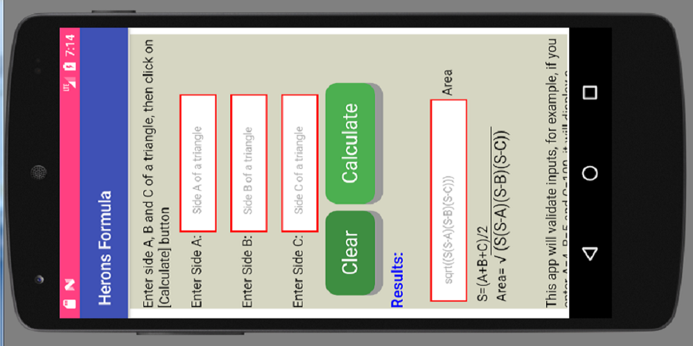 Deze app berekent de oppervlakte van een driehoek met behulp van de formule van Heron. Heron's formule is vernoemd naar Hero of Alexendria, een Griekse Engineer en Wiskundige in 10-70 na Chr. Kunt u nog steeds volgende formule om de oppervlakte van een driehoek met de 3 zijden berekenen.