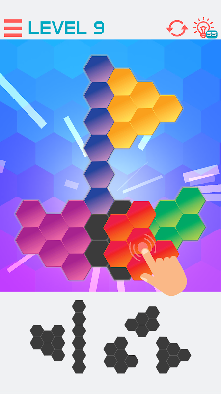 Het is heel eenvoudig om met dit spel te beginnen; iedereen zou onmiddellijk moeten kunnen beginnen met spelen. In het midden van het scherm krijg je een geometrische vorm te zien die bestaat uit zeshoekige rasters. Onderaan het scherm bevinden zich de "puzzelstukjes". Sleep de stukken naar de vorm om de vorm te voltooien. Je kunt de stukken op het bord laten vallen en als ze passen, breken ze. Je wint het spel als alle vormen op het bord zijn geplaatst en het bord volledig gevuld is, zonder overlappingen.
