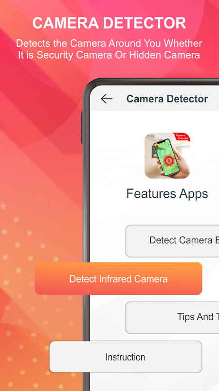 Quick Hidden Camera Finder - Spy Camera Detector app protect you from spy camera. If you are out of the city you stay at a hotel with family so for privacy you need such hidden camera detection and hidden microphone detector app through which you can discover Use your smartphone and Quick Hidden Camera Finder - Spy Camera Detector application and bring it close to any device that you doubt it.