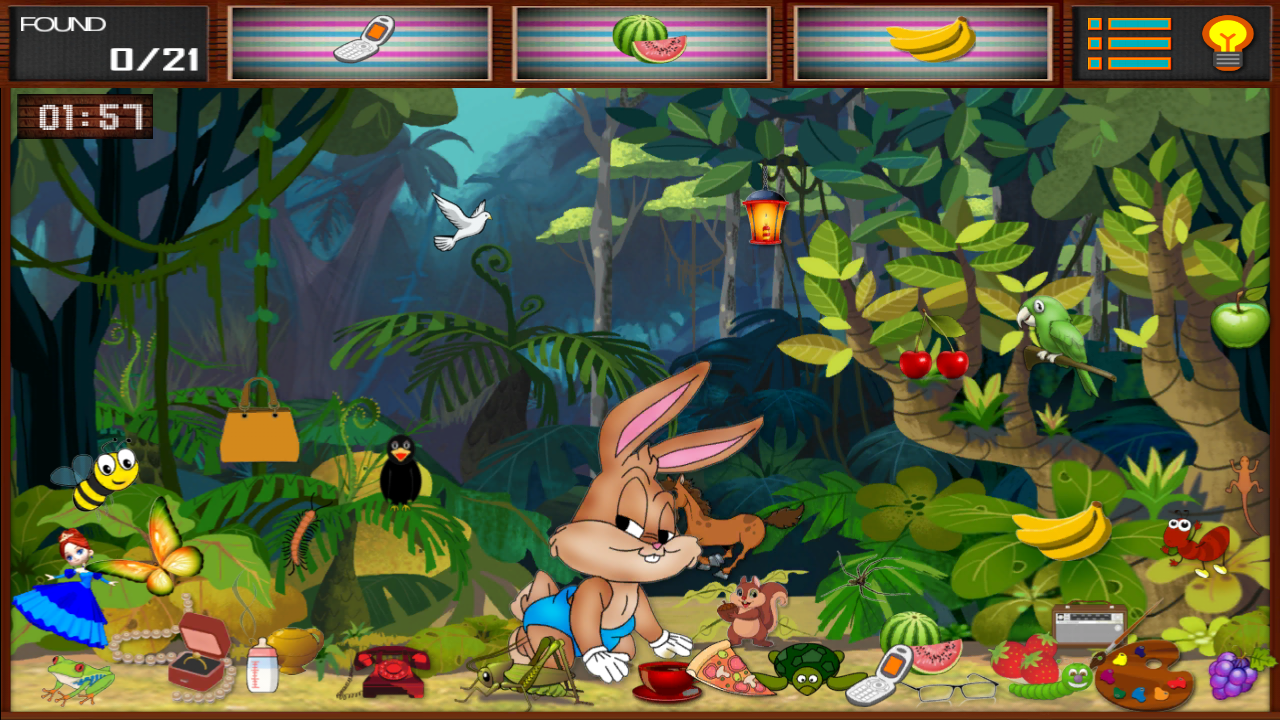 - Search for hidden objects, every time you play the same level, you get new missing items.