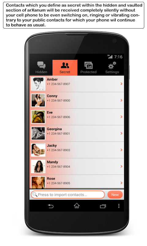 Contrary to other Apps arXanum allows you not only to dfferentiate and manage your SMS and MMS conversations as public or hidden, making it therefore impossible to access content which you would like to hide (these will only be accessible via a hotkey which will launch the hidden and secret vault mode) but foremost it provides the unique feature of silent receipt of content you want to hide from prying eyes without your cell phone to be even swichting on, vibrate or play the usual ringtone which will continue to be triggered for all public messages and content.