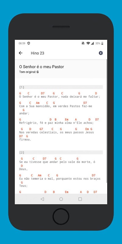 CCB gezangboek, met leesmodus of gecodeerde modus. Met een eenvoudige interface, met ondersteuning voor thema's. Nuttige bronnen voor het spelen van de gitaar: akkoordreferentie, automatisch scrollen, toonsoortwijziging, indicatie om de capotraste in het juiste huis te plaatsen om de originele toonsoort van het gezangboek te verkrijgen. Maataanduiding, maatsoort, vingerzetting, ritme. Speler voor het reproduceren van de hymnen.
