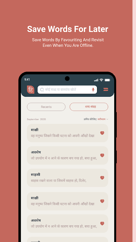 Al deze functies zijn beschikbaar in dit woordenboek, samen met een eenvoudige en snelle zoekfunctie, waarin u Hindi-woorden kunt zoeken door ze in het Romeins of Devanagari te typen. De state-of-the-art gebruikerservaring is ook doordacht om het leren van nieuwe woorden leuk te maken!
