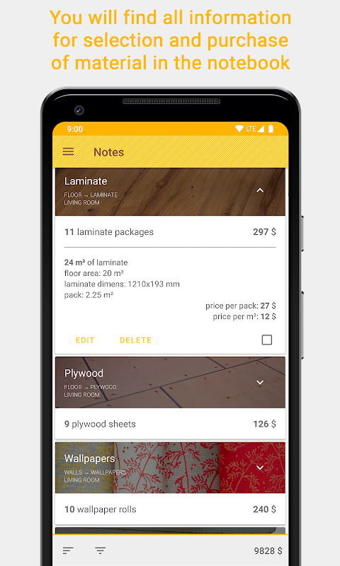 Toepassing zal helpen om de hoeveelheid materialen die nodig is om uw appartement te repareren te berekenen.
