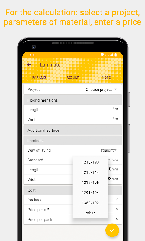 3. Voer de afmetingen en kenmerken van afwerkingsmaterialen in. De applicatie zal u de standaard vertellen, maar u kunt uw eigen invoeren (ze zijn te vinden op de verpakking van goederen);