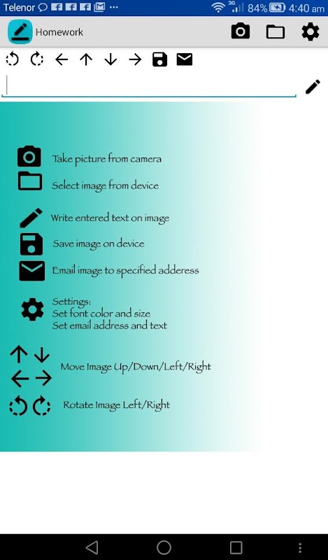 Sla definitief verwerkt beeld apparaat of direct te sturen naar leraar via e-mail functionaliteit is ook toegevoegd. De gebruiker kan lettertype kleur en grootte, evenals e-mail van de leraar te veranderen.