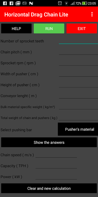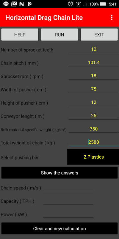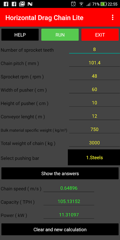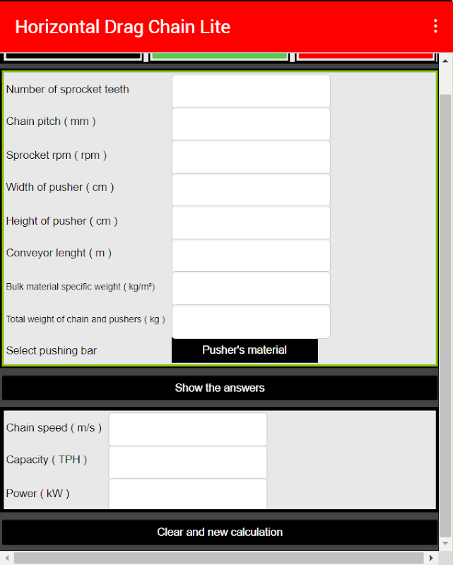 Toepassing voor het berekenen van de snelheid, capaciteit, kracht van drag kettingbaan.