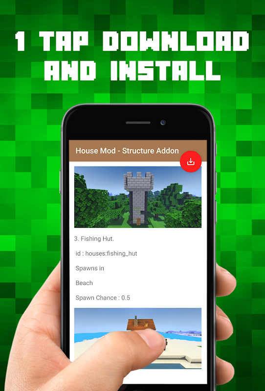 Deze House Mod Structure Add-on voor Minecraft PE-applicatie helpt je bij het downloaden en installeren van Just Structure Addon in je Minecraft Pocket Edition-spel. Vergeet al die File Explorer of BlockLauncher en krijg dingen sneller en gemakkelijker gedaan met ons installatieprogramma met één tik.