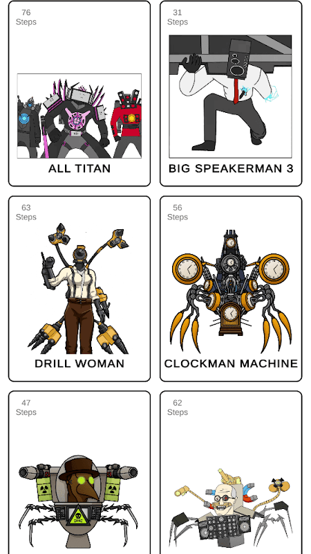 Wat te doen in de aanvraag? Selecteer om te beginnen het personage dat je wilt tekenen. Vergeet daarvoor niet een stuk papier, een potlood en wasgoed mee te nemen. Start de les nadat je een held hebt gekozen! Herhaal alle stappen die in de les worden gegeven en je tekent gemakkelijk het geselecteerde skibidi-toilettekenfilmfiguur. Geloof me, je hebt geen ervaring en tekenvaardigheid nodig. Alles komt goed! Volg de lessen van de applicatie Hoe skibidi toilet stap voor stap te tekenen en het resultaat zal niet lang op zich laten wachten!