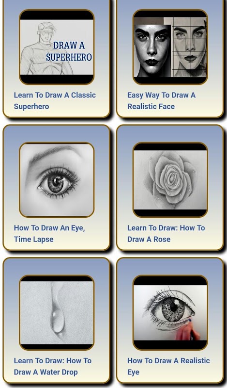 Learning how to draw will be an easy task with this apps. You can make drawings of hands, eyes, landscapes, ... Only with your smartphone or tablet with android operating system, easy and from home you will get drawing techniques, with tutorial videos that will show you how to draw. The pencil drawings will be baby games.