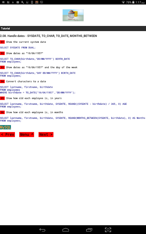 This application is a Tutorial and How To Guide for the popular Oracle Data Base Management System, Structured Query Language (SQL).