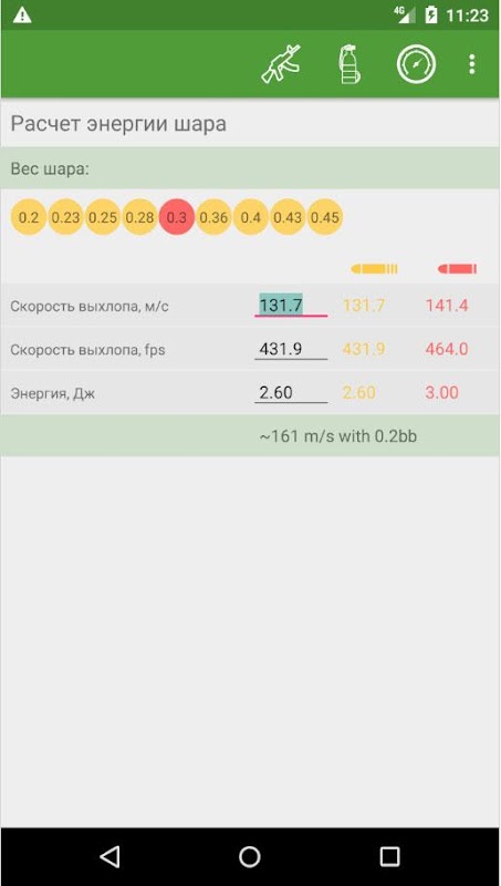 1. Расчет энергии шара в м/с, FPS и Дж, исходя из его веса.