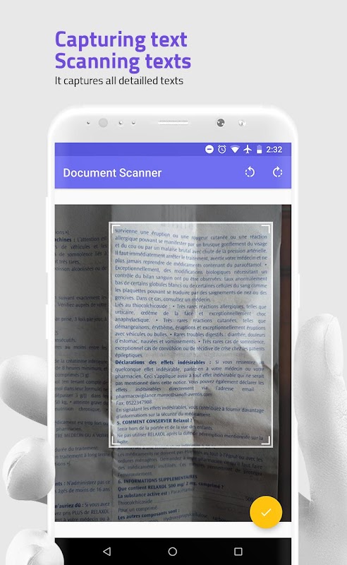 HQ Document Scanner is the best document scanner app and very easy to use. Simply hold your smartphone or tablet over a document and HQ Document Scanner will automatically scan it. HQ Document Scanner app will then crop the document and optimize colors then save it for you on a form of text that you can copy or share via social media or email.