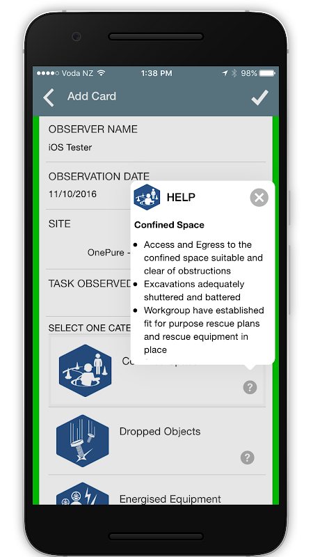 This application is used to record, categorise and submit observations of safe and unsafe behaviours on specific Worley construction sites.