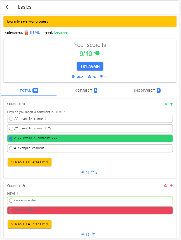 💾 Bewaar uw favoriete quizzen voor gemakkelijke toegang en houd uw voortgang bij. Beoordeel en versterk uw HTML-vaardigheden op elk gewenst moment.