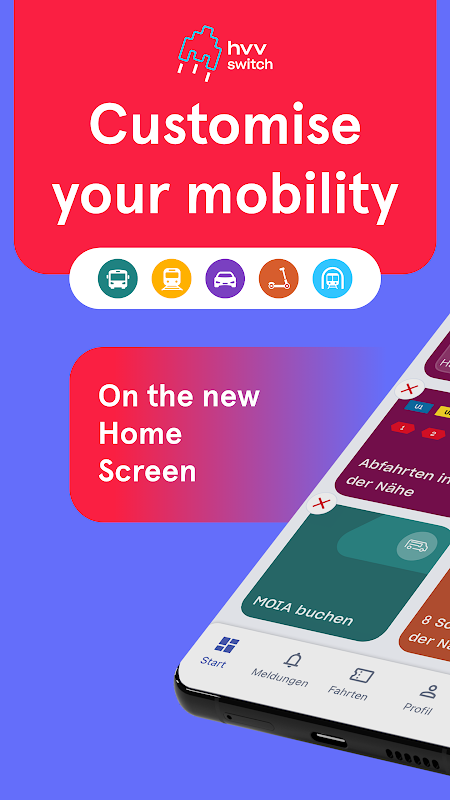 Jouw mobiliteit, jouw app: Met een nieuw design en een aanpasbaar startscherm voor tickets, dienstregeling, autodelen, e-scooters en shuttles is hvv switch jouw dagelijkse metgezel.
