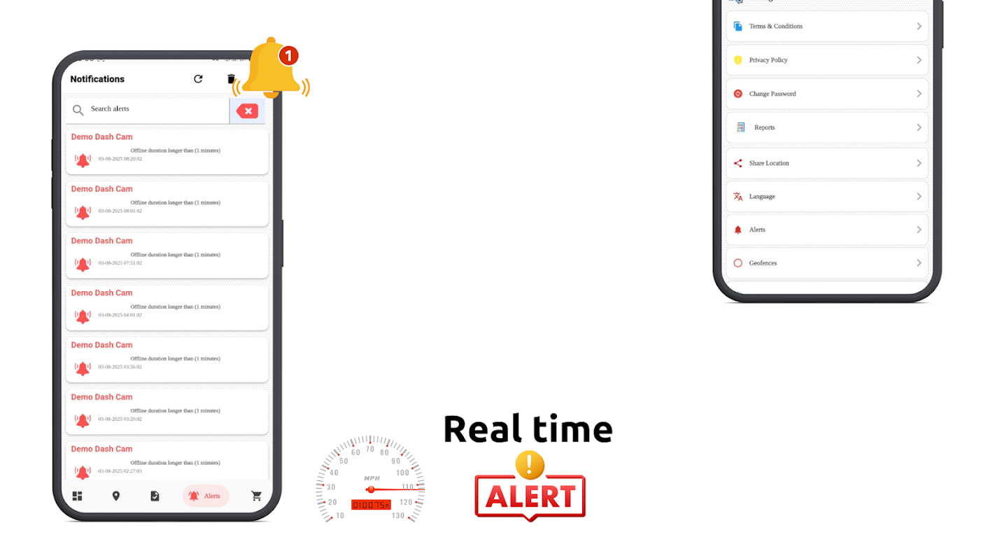 Ontvang in realtime meldingen over te hoge snelheid, hard remmen, scherpe bochten en ongeoorloofd verkeer.