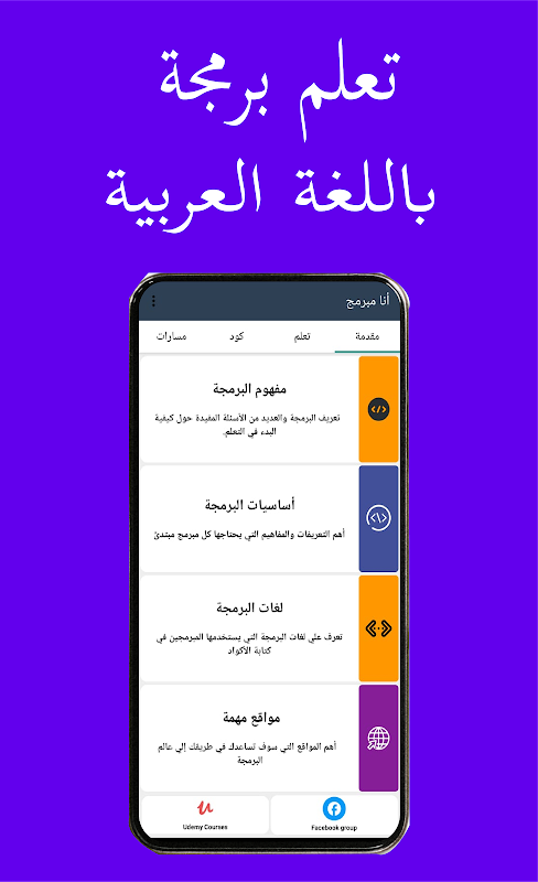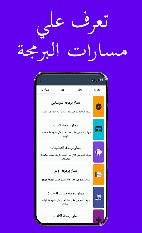 Een onderscheidende en eenvoudige applicatie voor het aanleren van de basisprincipes van programmeren in de Arabische taal, aangezien de applicatie een basisprogrammeeringang bevat voor elke beginner op het gebied van programmeren en veel programmeervragen en -antwoorden die elke beginnende programmeur ten goede komen en belangrijke definities en concepten bevatten voor elke programmeur die een professional wil worden op het gebied van programmeren en bevat ook inhoud gericht op het aanleren van algoritmen Genetische manipulatie, verschillende besturingssystemen, wetenschappelijke logica en sites die elke programmeur nodig heeft op weg naar de wereld van programmeren en programmeertalen voor alle programmeerdisciplines zoals Python, C, C#, frontend- en backend-talen voor webontwikkelaars, applicatietalen zoals Android en iOS, en het bevat ook een lijst met netwerken en lijsten Andere met betrekking tot het framework voor programmeertalen zoals filters en laravel, en uitleg van andere frameworks zoals Xamarin en anderen