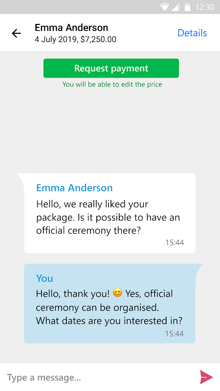 As our wedding planner, you will be instantly notified of any incoming inquiries. You will be able to communicate via the app, customise your services based on the client’s needs and receive bookings securely via the app.