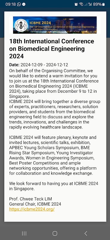 Van 9 tot en met 12 december 2024 wordt in Singapore de 18e International Conference on Biomedical Engineering (ICBME 2024) gehouden.