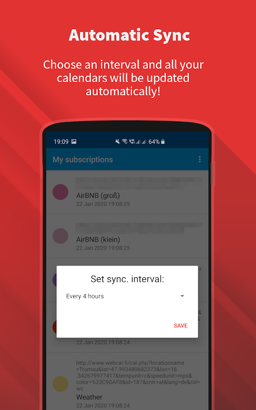 Voeg hoogdagen en vakanties toe, evenementen van uw sportteams, tijdschema's van uw school/universiteit of andere evenementbestanden in ics/ical-formaat. De app importeert deze gebeurtenissen voor je en geeft ze weer in je favoriete agenda-app op je Android - het integreert naadloos in je apparaat. ICSx⁵ maakt gebruik van de modernste technologie voor synchronisatie die de mogelijkheid biedt dat u altijd de meest up-to-date versie van elk toegevoegd agendabestand heeft. Alle evenementen worden perfect afgeleverd in de agenda van je apparaten.