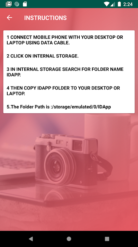 This camera app is used for taking photos according to the data present in the excel file and automatically updating the photo no in image no column of the excel file. This app is suitable for the id card professionals who create id cards in bulk with an id card software, using this app they take photo graph of the student based ( in sequence of ) their data name, classname etc. After using this app they can download the shot photos and updated excel file from their android device to their computer's hard disk.