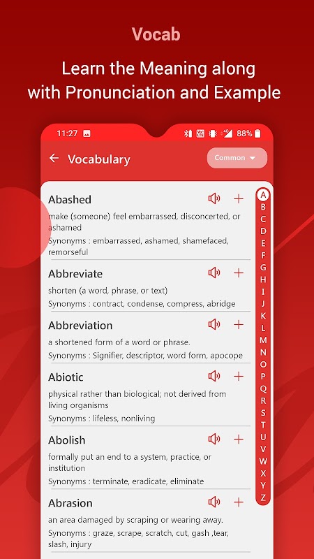 👉 Vocabulary – Check out our extensive and detailed list of vocabulary starting from A-Z.! Each day you can start learning 10 new words! You can hear the pronunciation of the word, meaning, synonyms, and check the relevant examples. There is an option to search the vocabulary words based on the topics as well, such as words related to Communication, Business and Finance, Feelings, Academics, Culture and Social, and many more. This means, if you want to search for a word related to Sports – All you need to do is click on ‘Topic’ under the Vocabulary page and check out the sports-related words. Interesting, right!