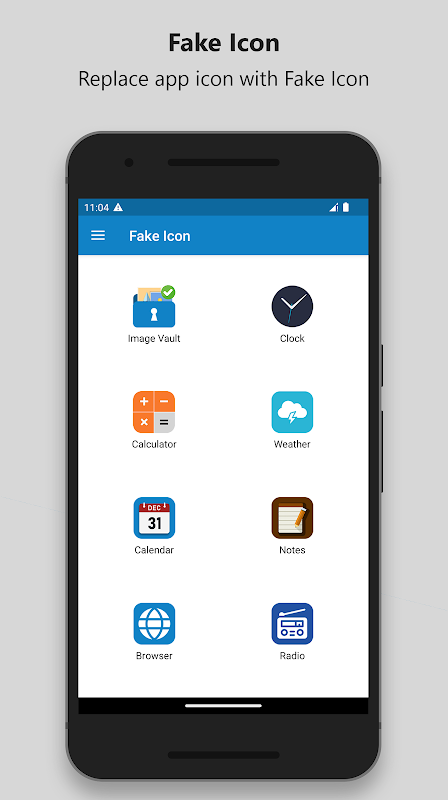 • Verberg het Image Vault-pictogram van het startscherm of vervang het door een wekker, weer, rekenmachine, kalender, notitieblok, browser of radio op het startscherm. Zo kunt u indringers gemakkelijk misleiden en uw afbeeldingen veilig houden.