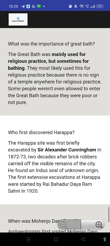 In deze app ga je op een reis door de tijd en ontdek je de mysteries van steden als Harappa en Mohenjo-Daro. Ontdek hun baanbrekende prestaties op het gebied van architectuur, kunst en het dagelijks leven, en maak gebruik van interactieve functies die de oude geschiedenis tot leven brengen. Of je nu een geschiedenisliefhebber bent, een student of gewoon nieuwsgierig naar ons gedeelde verleden, de Indus Valley Explorer biedt een boeiende blik in een beschaving die de basis heeft gelegd voor toekomstige samenlevingen.