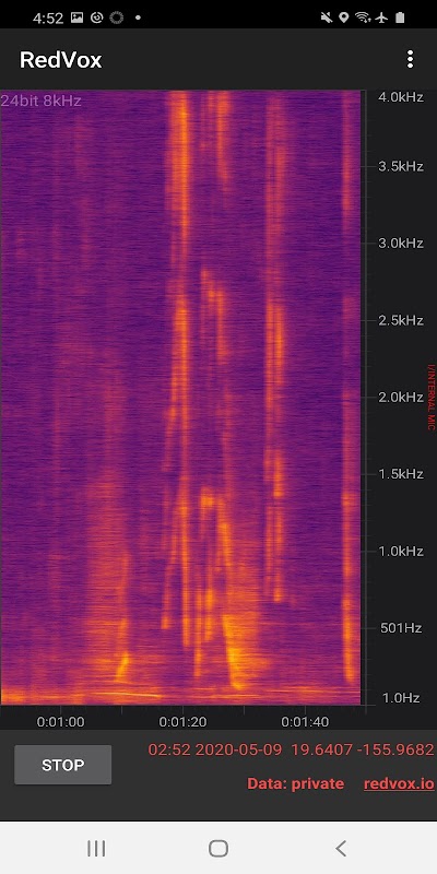 RedVox Recorder kan op de achtergrond opnemen om continu infrageluidgebeurtenissen en omgevingsgeluid te monitoren. Hoewel doorgaan met opnemen meer stroom verbruikt, kan het met het scherm uit de interne batterij vele uren leeglopen.