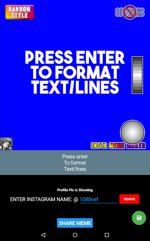 Simple, fast, easy to use text editor for creating Memes. Developed especially for Instagram users. You can enter you Instagram screen name to insert your profile picture into your meme. Also feature a Random Style Button which chooses a unique color/font combination each time it is pressed.