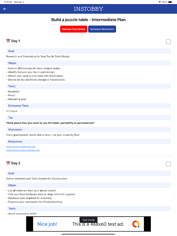 Typ gewoon waarin u geïnteresseerd bent (of het nu gaat om 'houtbewerking', 'tekenen', 'fotografie' of zelfs 'gitaar leren spelen') en Instobby genereert onmiddellijk een gestructureerd vijfdaags startplan met alles wat u nodig heeft om te beginnen.