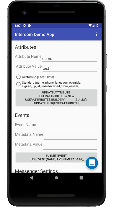 This is a demo mobile app that illustrates the Intercom Mobile SDK. It shows off different features available in the mobile SDK and also allows you to connect your own workspace to this