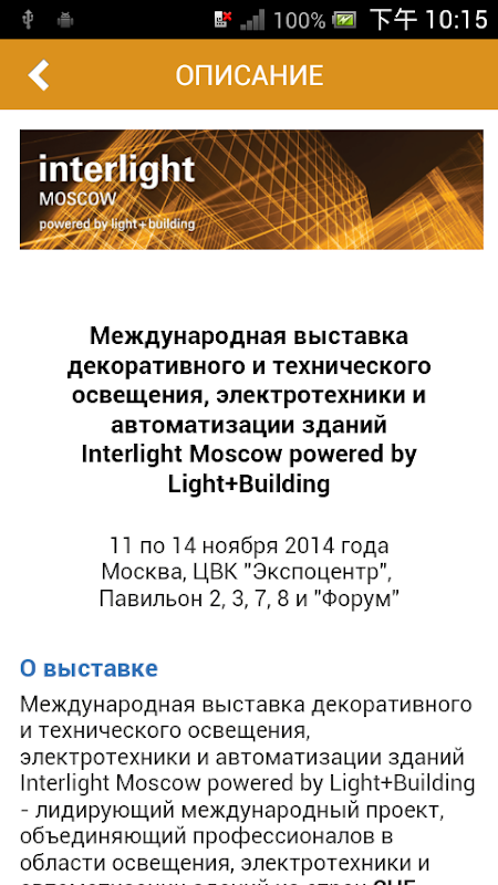 Установите себе это приложение, для комфортного посещения выставки «Interlight Moscow powered by Light + Building», которая будет проходить с 11-14 ноября 2014 года.