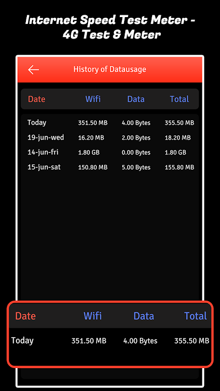 Internet Speed Test Meter - 4G Test & Meter application display internet speed test And Data usage per app. Easy to see History about Data usage with details like date, wifi, data, and total usage. Get everyday perfect Data usage history by our smart application.