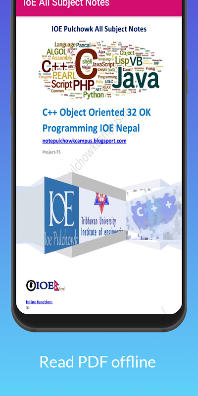 IoE All Subject Notes is een GRATIS app voor het offline lezen van PDF-notities die beschikbaar is voor Android en andere smartphones. IoE All Subject Notes heeft geen toestemming nodig voor zijn volledige functie. Lees al uw onderwerpaantekeningen overal waar u geen internetverbinding nodig heeft, het zal alle pdf downloaden als er updates zijn op het moment van installatie en u bent klaar om alle ENGINEERING-aantekeningen op elk moment te lezen. Deze app bevat pdf met de nieuwste syllabus en notities. Binnenkort komt er nog veel meer