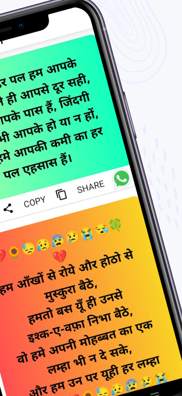 हिंदी शायरी Alle Love Shayari-volkeren kunnen het Hindi gemakkelijk begrijpen. De nieuwste shayari zijn beschikbaar in deze app, maar sommige shayari werken online en sommige shayari werken offline. we voegen elke dag de nieuwste shayari toe.