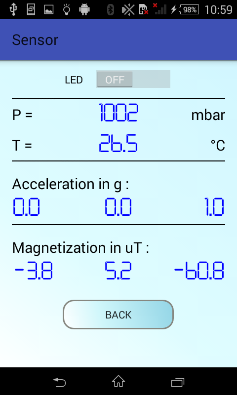 The complete device makes use of Insight SiP ISP130301 BLE module together with low power 3-axis accelerometer and temperature / barometer sensors connected to a primary button cell battery CR2032. The Freescale FXOS8700CQ 3-axis linear accelerometer and 3-axis magnetometer is used to detect acceleration and is combined with ST Micro LPS331AP temperature and barometer sensor.
