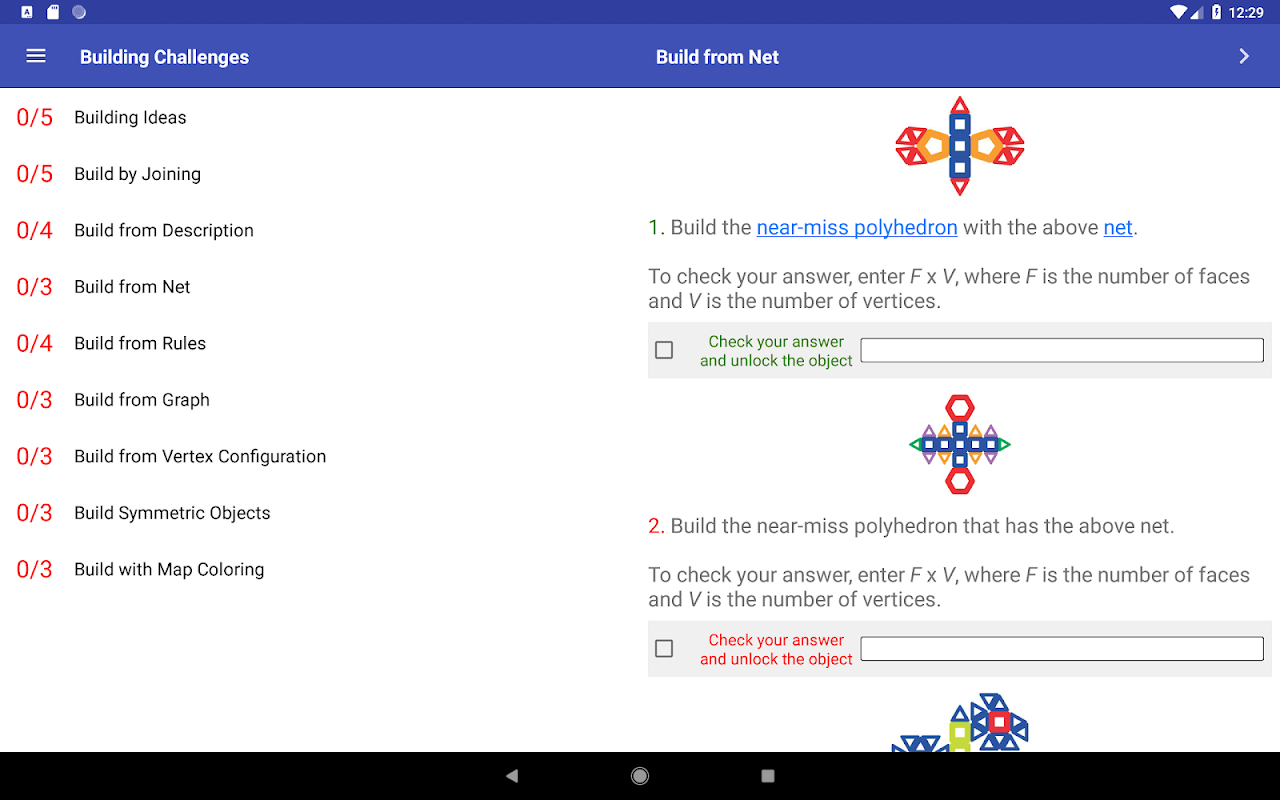 A set of building and math challenges further reinforces the concepts presented. Solving some problems unlocks additional objects in the database.